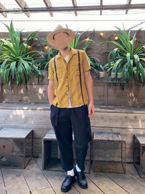 ボウリングシャツはカラーが豊富ですが、その中でもマスタードイエローは挑戦しやすいのでお勧め。こちらのようにパンツと合わせるだけでおしゃれな雰囲気を出すことができます。ハットと合わせると更におしゃれ感がアップします。パンツはスラックスにかえるときれいめに、デニムに変えるとルード系になります。