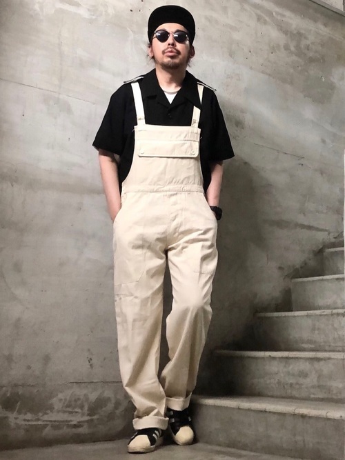 ボウリングシャツをインナーとして着るのはかなりのおしゃれ上級者。こちらはベージュのオーバーオールと合わせることで、職人風のイメージに仕上げています。キャップやサングラス、時計などボウリングシャツと同じカラーで合わせているため、全体に統一感が生まれます。