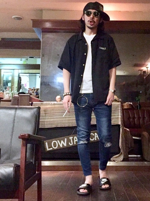 ダメージデニム×キャップ×サングラスはボウリングシャツと合わせるとルード系の基本になります。インナーに白の半袖でも良いですが、長袖シャツを合わせると秋まで着まわせるコーデに。