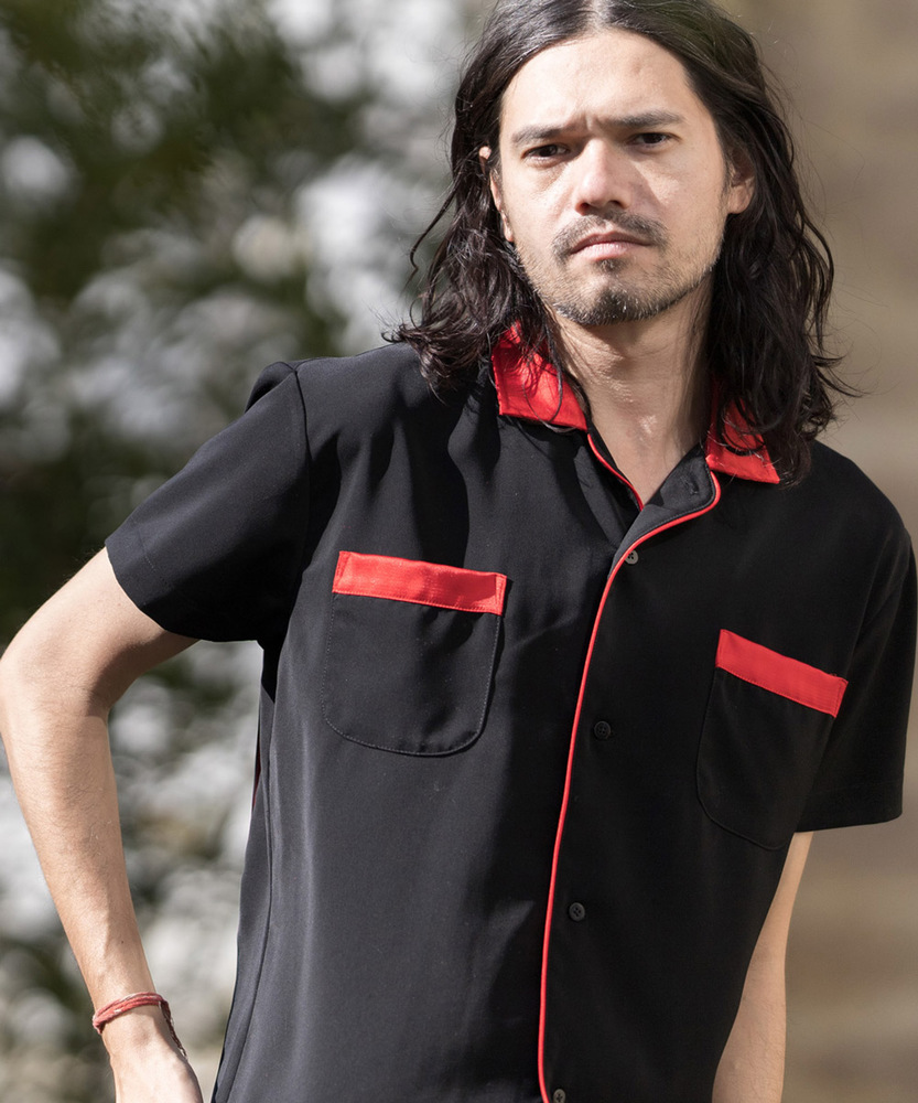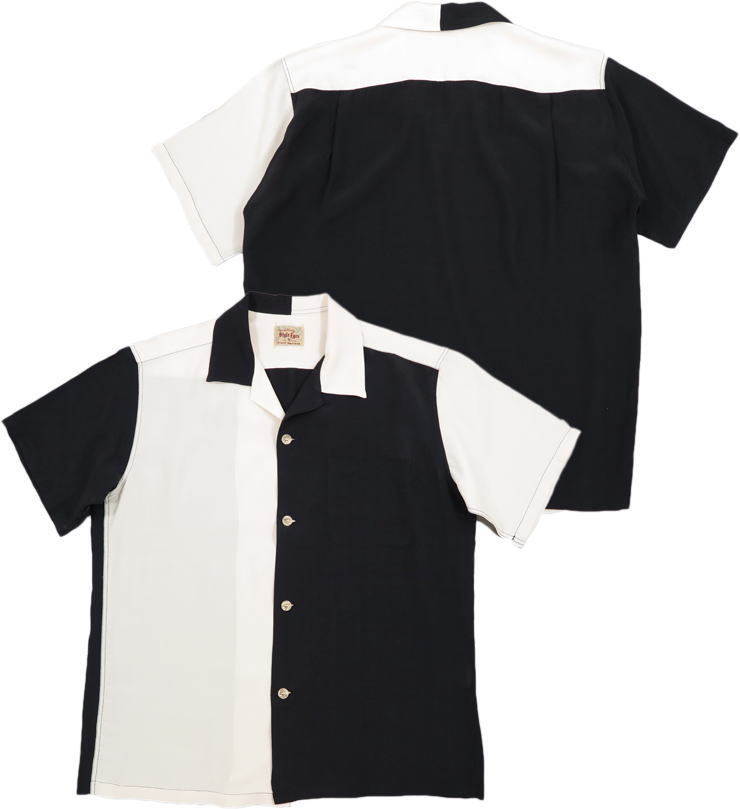 1950年代風にボディを2色のデュオトーンアシンメトリーで仕上げたボウリングシャツは人目を引くこと間違いなしのアイテムです。裾はスクエアカットになっており、当時のボウリングシャツの形状を踏襲。ヴィンテージ感あふれるアイテムと合わせればルード系アメカジスタイルが完成します。