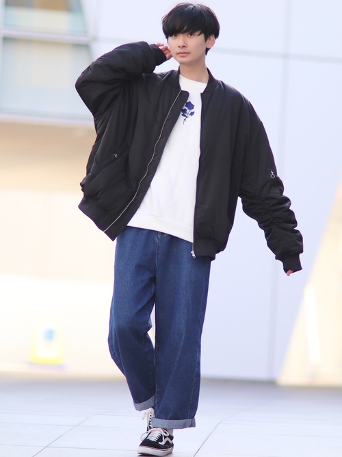ワイドパンツとMA-1のカジュアルメンズコーデ。ワイドパンツをロールアップし、スニーカーをしっかり見せることで、オシャレ感がアップします。白と黒と青のシンプル配色で、落ち着いた雰囲気に。