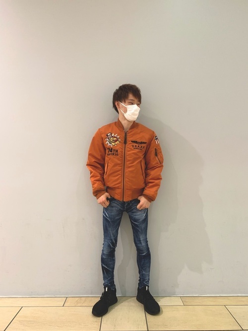 オレンジ系MA-1×デニムパンツ