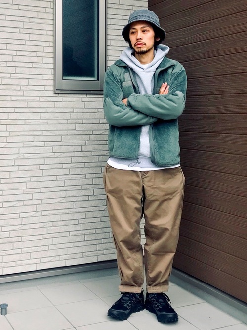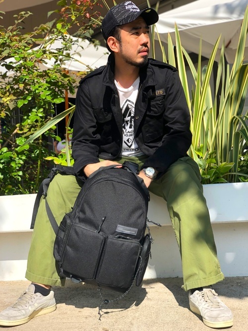 コーエンブランドの定番人気になったクライミングパンツとM-65のメンズコーデです。細身でテーパードなラインのパンツの裾をロールアップし足首を見せることで、こなれ感が出ます。