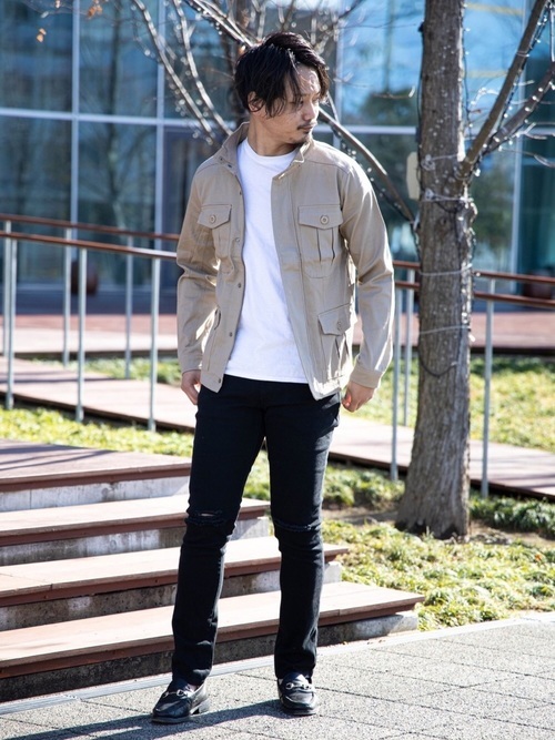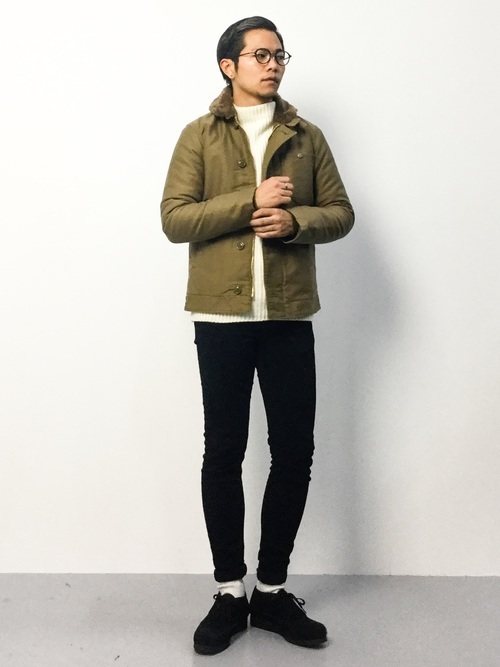 ミリタリー感あふれるデザインのM-65は、スキニーパンツも着こなすことが出来ます。ハイネック仕様になっているので、男らしさに渋さがプラス。ベージュのアウターに、黒のボトムスを合わせると王道のミリタリースタイルになります。