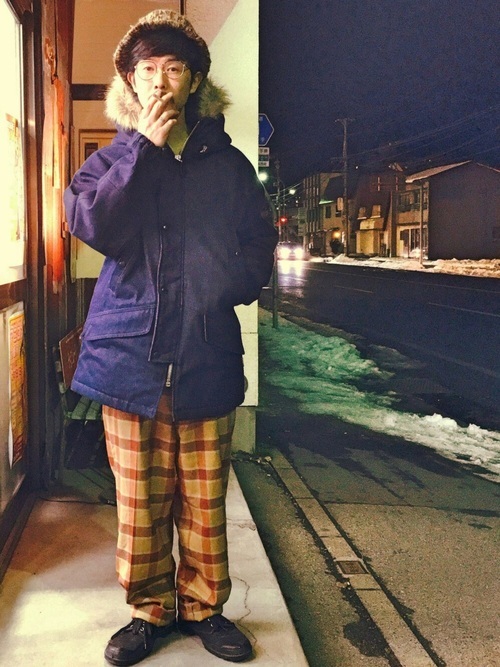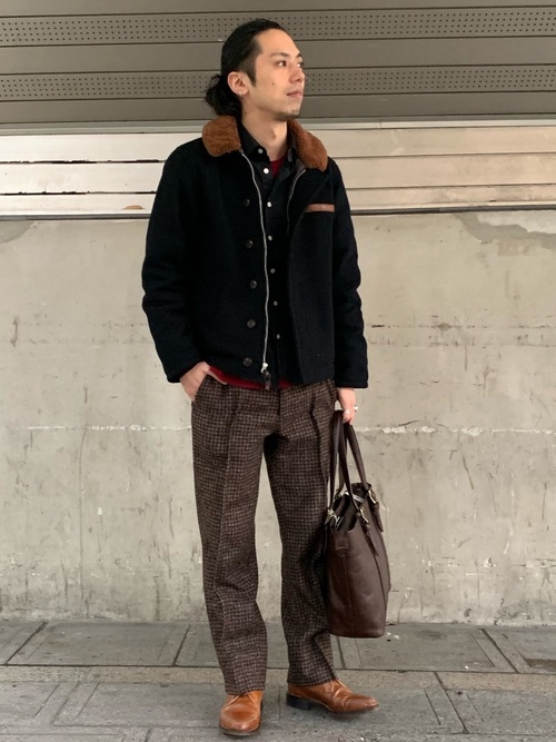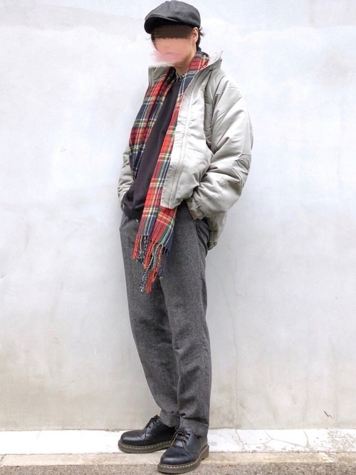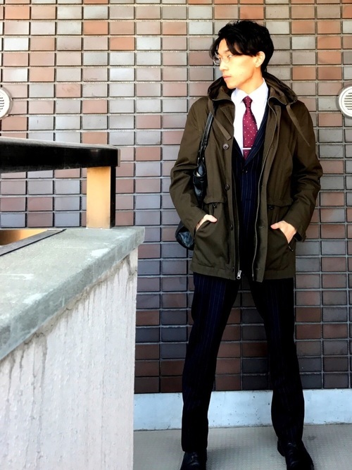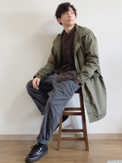 ロング丈のM-65にきれいめなグレースラックスを組み合わせたメンズコーデ。アースカラーで全体の統一感を高めているテクニックが見事です。