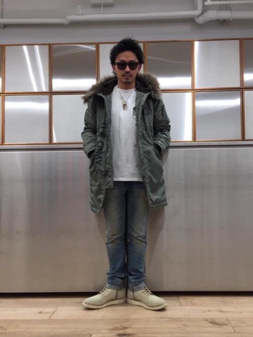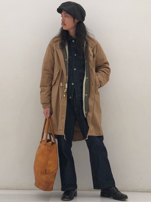 ゆったりとしたサイズ感のM-51(モッズコート)にデニムジャケットとワイドパンツを組み合わせたメンズコーデです。当時の軍背景をイメージして作られているので、中にジャケットを着てもごわつきません。冬に1着あれば重宝しますよ。