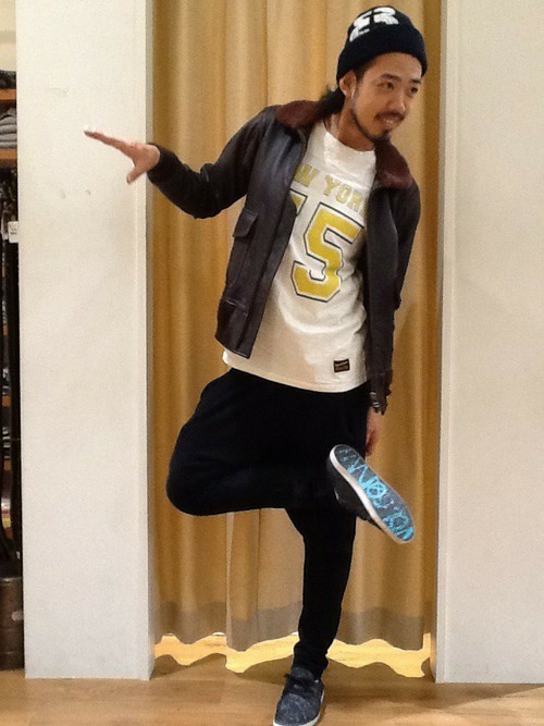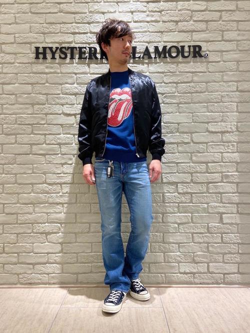 HYSTERIC GLAMOURブランドのスカジャンにデニムパンツを合わせた王道のメンズコーデです。アウターやインナー、ボトムスを同ブランドで揃えると、とてもスタイリッシュな仕上がりになります。足元がスニーカーなので気張らない印象になっています。