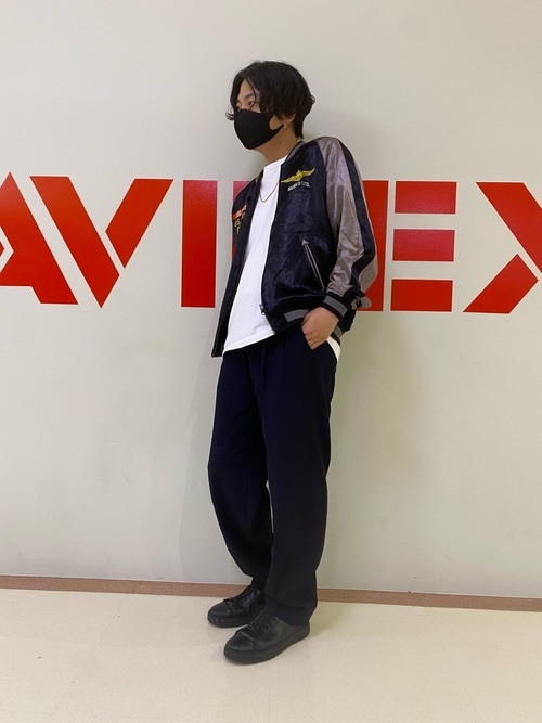 両面使用できるほど裏生地のデザイン性が高いスカジャンにワイドパンツを組み合わせたメンズコーデです。アウターのサイズ感をややタイトめにすることで、ワイドパンツを合わせてもバランスが良くなってオシャレに見えます。
