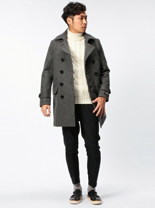 モノトーン系でまとめたメンズコーデ。黒パンツをベースに白ニットとグレーのピーコートをバランス良くミックスさせ、軽快な仕上がりになっています。