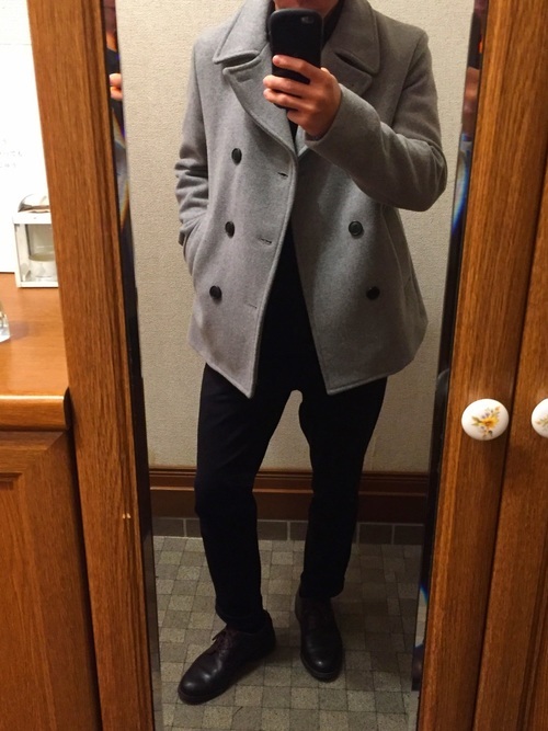 グレーのピーコートにブラックパンツとドレスシューズを合わせたビジネスコーデです。かわいらしい印象を与えるピーコートですが、モノトーンカラーで統一するとクールな雰囲気に早変わりします。