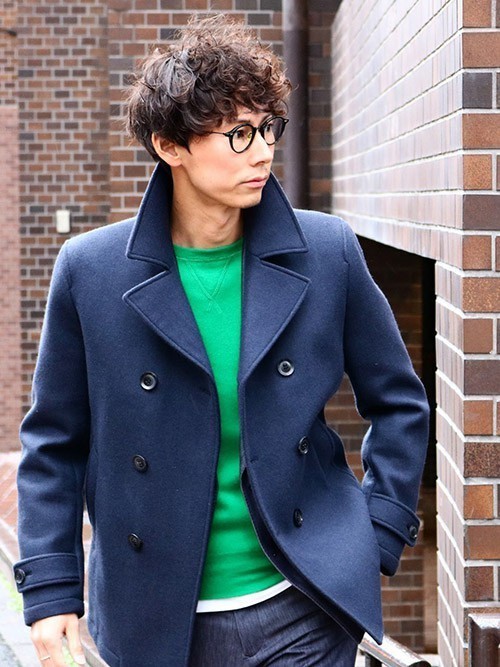 きれいめ色のピーコートをナチュラルに着こなしたメンズコーデ。滑らかな曲線が美しいシルエットを作り出しているので、主張の強いカラーでも決して重苦しい印象を与えません。オシャレなうえに、できる男を演出できます。