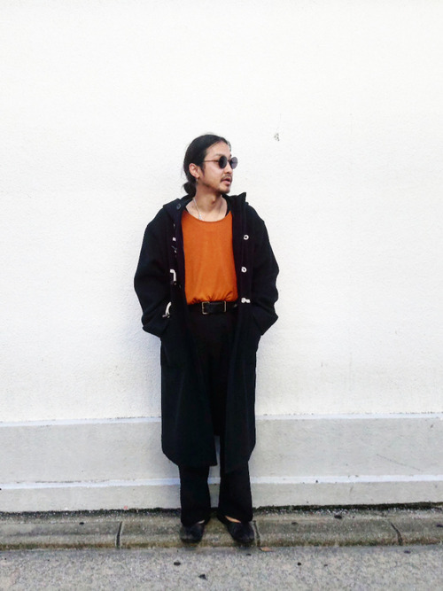 ダッフルコートにオレンジ系のレイヤードロングカットソーを合わせたメンズコーデ。ふっくらとした着心地の良いダッフルコートなので、インナーも柔らかい素材のものを選ぶことで、ラフな印象を与えています。サングラスをかけると、よりこなれ感が出てオシャレですね。