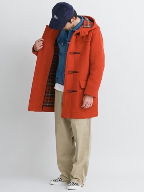 オレンジ系のダッフルコートにベージュパンツを組み合わせた秋を感じさせるメンズコーデです。厚手のメルトン生地なのに、重たく感じないのはオレンジ色を選んでいるから。オレンジ色が浮き過ぎないように、ベージュパンツを取り入れたトータルカラーが優秀です。