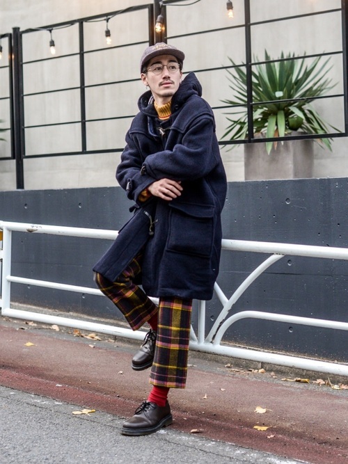 BURBERRYのダッフルコートを使ったメンズコーデです。子どもっぽい雰囲気になってしまうダッフルコートに、チェックパンツを合わせると大人っぽいスタイルに早変わりします。キャップと革靴で全体のバランスを整えているところが秀逸です。