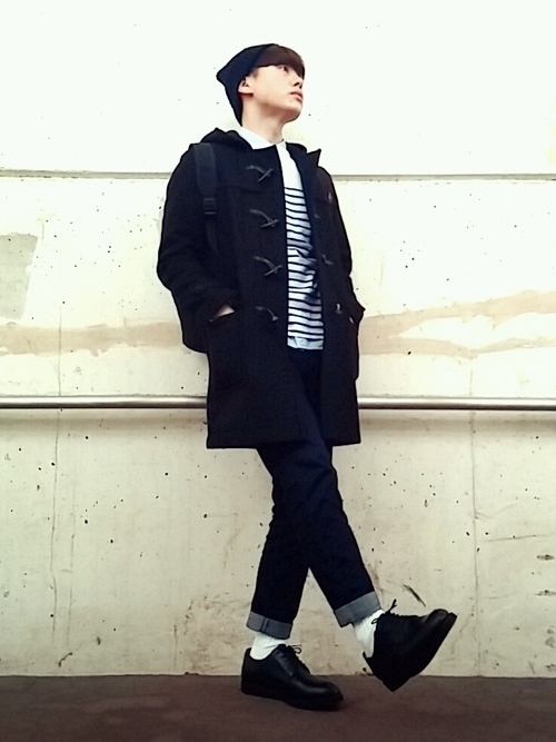 ダッフルコートにボーダーのカットソーを合わせたメンズコーデです。ダッフルコートの野暮ったいイメージを、爽快感あるボーダー柄で相殺することができます。