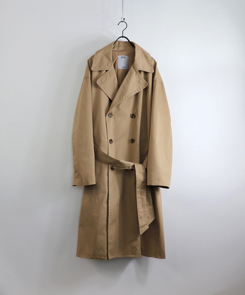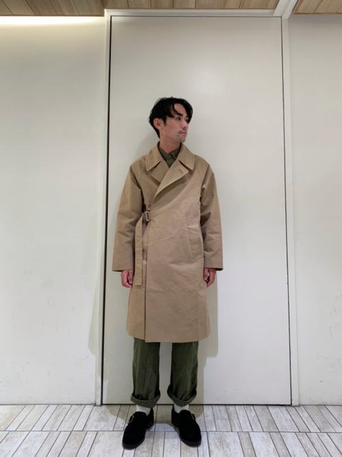 トレンチコートの原型と言われ、今注目アウター筆頭のタイロッケンコートをベルトで閉めているメンズコーデです。ベーシックなデザインで、トレンドのベルト通しは体周りをぐるっと一周し、バックルで止める本格仕様に。ハリ感ある素材で、シルエットを美しく見せる効果があります。