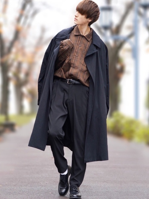 トレンチコート×チェックシャツ×スラックス