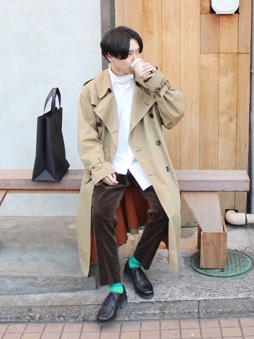 ベージュのトレンチコートのインナーに白シャツとタートルネックを合わせたメンズコーデ。トレンチコートのドレスな雰囲気と他アイテムが放つカジュアルなテイストが絶妙なバランスを生み、イマドキの着こなしになっています。