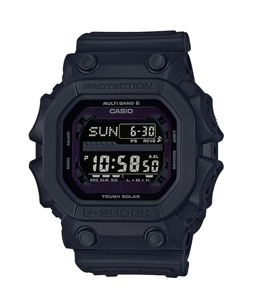 写真はブランドカラーのブラックにこだわって、ワントーンで素材感を感じさせる仕上げになっています。各方向からの衝撃に対する耐久性と、スクエアフォルムをであるGXW-56をベースモデルに、マットブラックで時計のフォルムが際立ちます。カラーバリエーションでアクセントカラーがレッドとオレンジも。
