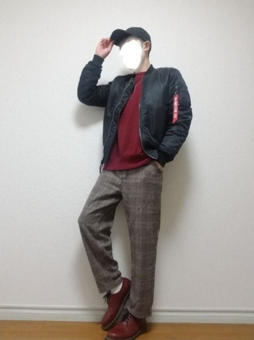 アルファインダストリーズのMA-1ジャケットをタウンファッションに取り入れたキレイめコーデ。全体に色味を抑えて落ち着いた印象に、ドレスシューズでワンランクアップしていますね。