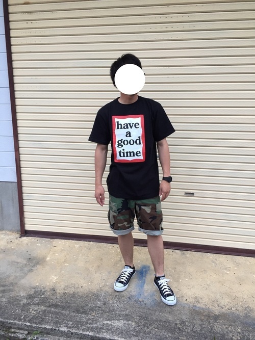 ロスコのショートパンツにインパクトのあるTシャツを合わせてカジュアルに。ショートパンツの裾の折り返しと、靴もローカットで肌見せのバランスがとても上手ですね。時計はGショックのブラック、靴も黒で揃えています。
