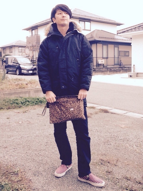 ボリュームのあるスピワックのミリタリージャケットにスリムなストレートパンツで脚長効果抜群のコーディネイトです。ブラックコーデにヒョウ柄のクラッチバックが映えていますね。