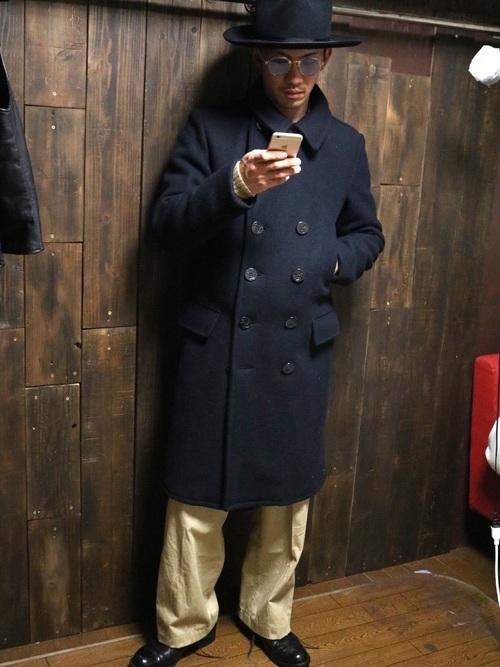 ショットのピーコートもアメリカ軍に納品していた歴史のあるアイテム。ハットと US NAVYのサービスシューズでフォーマルな装いになっています。ピーコートの無駄のないシンプルなシルエットを生かしたコーディネートです。