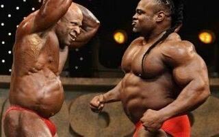 これは尋常ではない筋肉量から『プレデター』とも呼ばれていたカイグリーンのバブルガットです。横から見るとかなりお腹が出ているのがわかりますね。さらに、横にいるのは先ほども紹介したフィルヒースです。これは連覇が止まる前の大会ですが、相当バブルガットに悩まされていたことがわかりますね。