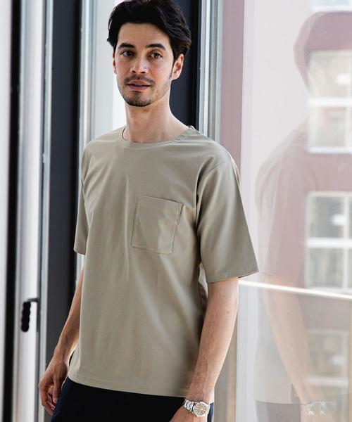 ポリエステルやコットン、麻などいろいろな種類の素材を組み合わせて作っている胸ポケット付きの半袖カットソー。落ち付いた色合いとスリムになり過ぎないシルエットで、リラックス感のある着こなしができます。サイドにはスリットが入っているので動きやすく、インナーを見せればおしゃれな着こなしができデザイン性も機能性も高いカットソーです。