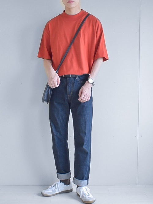 鮮やかなオレンジの無地のカットソーをコーデのアクセントにした着こなしです。ストレートのデニムにカットソーをインし、すっきりとしたカジュアルなコーデになっています。ショルダーバッグや時計など、小物を上手に取り入れてトレンド感のあるスタイルにしているのもポイントです。