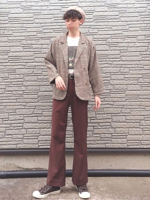 チェックのテーラードジャケットとベレー帽を合わせたブリティッシュスタイルには、アートプリントのカットソーが相性抜群。フレアパンツを使うことで上品で大人っぽい印象になり、フレアパンツにカットソーをインしてきれいめのコーデに仕上がっています。全体的にブラウン系の色でまとめており、秋におすすめのスタイルです。