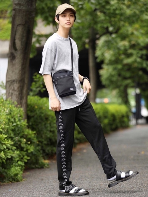 カットソーとトラックパンツの組み合わせは、スポーティーで着心地も楽なのが特徴です。こちらの写真はグレーのカットソーにスポーツブランドのカッパのトラックパンツを合わせていますが、足元に靴下を取り入れてきちんと感のあるスタイルにしています。