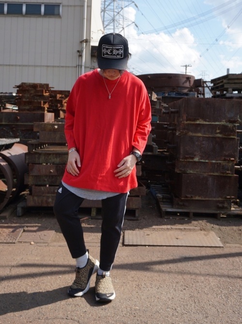 ビッグサイズの長袖カットソーとスリムなトラックパンツを使ったストリートファッションコーデです。赤のカットソーはインパクトがありますが、カットソーにタンクトップをレイヤードし、内側のタンクトップの色を差し色にすることでこなれ感を演出しています。柄物のスニーカーもコーデのアクセントになっており、個性の光るおしゃれな着こなしです。