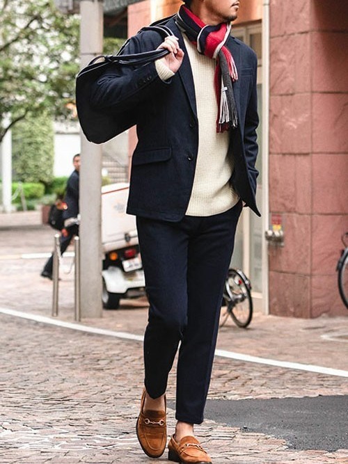 ネイビーのテーラードジャケットと同じ色のパンツで統一された大人なセットアップコーデです。インナーをシンプルな白にすることで暗い印象がなく、明るく清潔感のある印象になります。冬のコーディネートは重くなりがちですが、全体的に清潔感のある爽やかな色合いなので軽々しい印象になります。