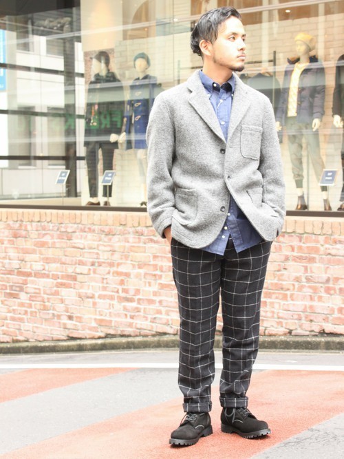 冬らしい暖かみのあるウール素材のグレーカラーテーラードジャケットにパンツのチェック柄がアクセントになり、スタイリッシュなカジュアル冬コーデです。インナーをニットではなくシャツにすることでカジュアルの中にきちっとした印象を与えてくれます。