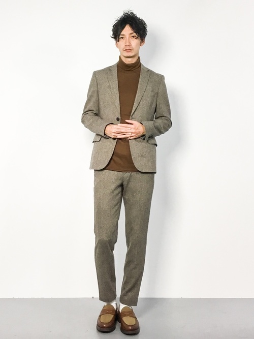 上下ともにベージュカラーで統一されたジャケットとパンツにインナーのタートルネックと靴がブラウンでまとめられているので秋冬らしい暖かなコーディネートになっています。タートルネックは大人な印象をもたらしてくれるのでテーラードジャケットには相性抜群です。