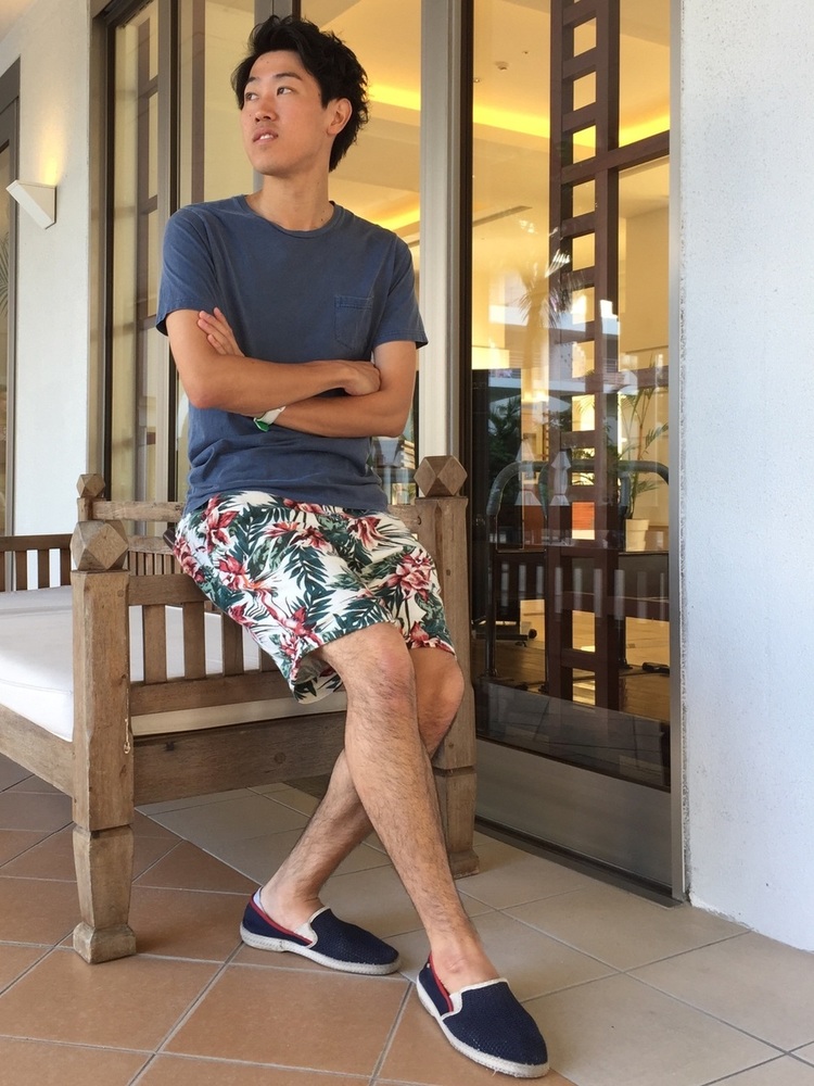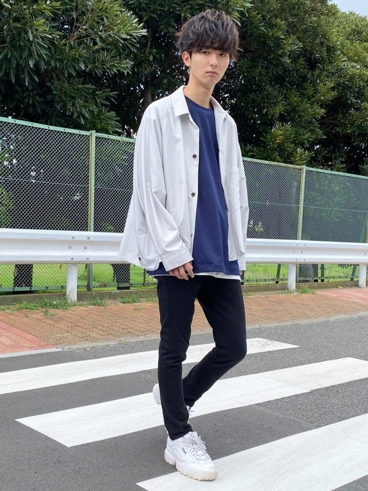 着まわしやすいカラーのネイビーTシャツですが、ここからは、色別のボトムスやハーフパンツ、ジャケットなど、様々なアイテムと合わせたコーデを紹介します。