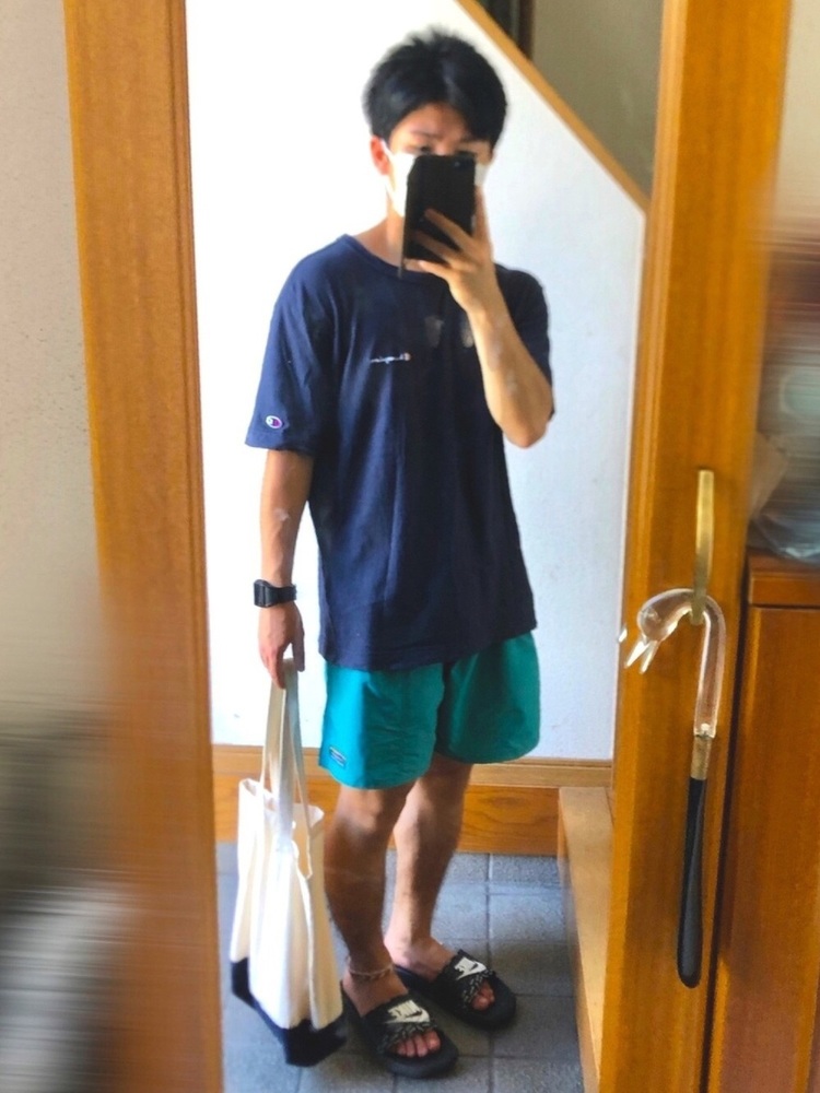 ネイビーTシャツとグリーンのショートパンツのコーデです。グリーンのボトムスを合わせるとスポーティでアクティブな印象を受けます。夏のスポーツスタイルです。