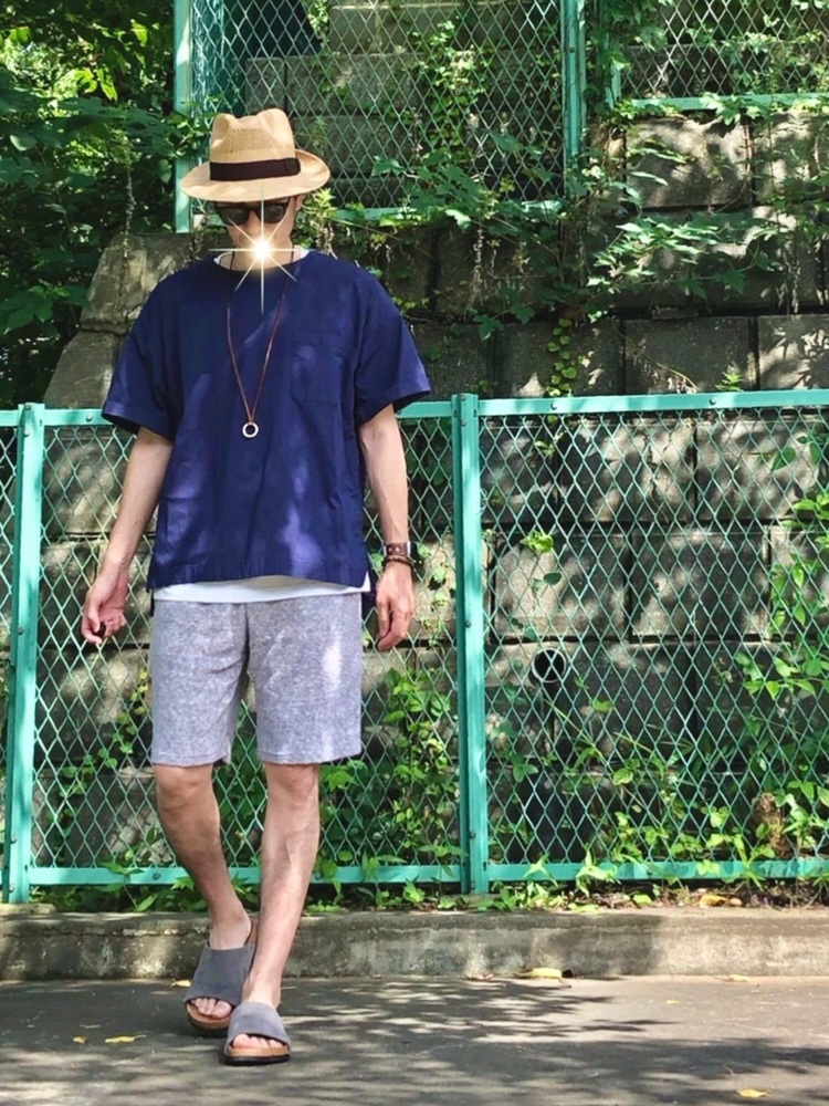 ネイビーTシャツとパイル素材のショートパンツのコーデです。足元もサンダルで涼しげですし、ストローハットもよいアクセントになっています。カラーもブルー系で統一しているので、夏らしい爽やかな着こなしです。