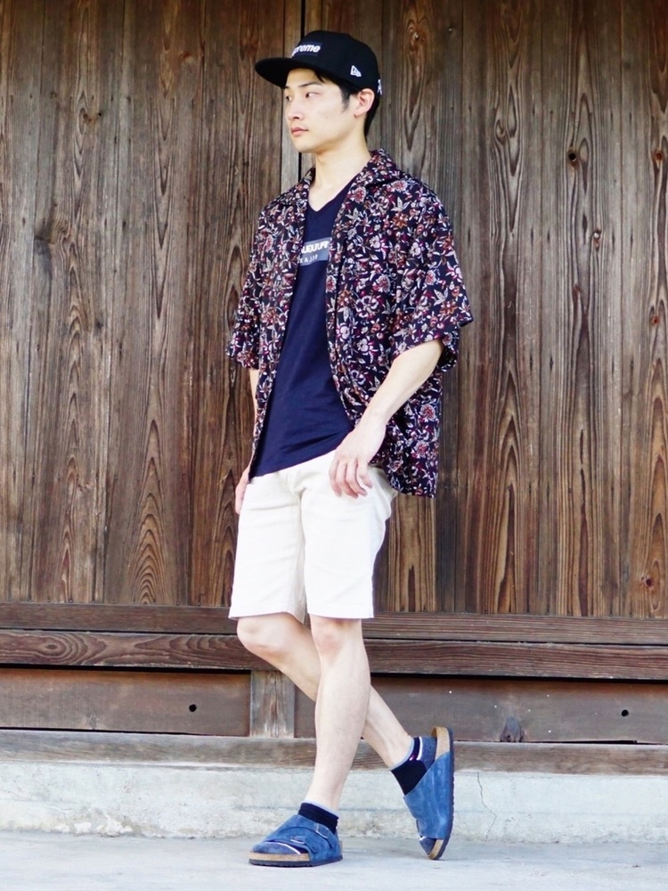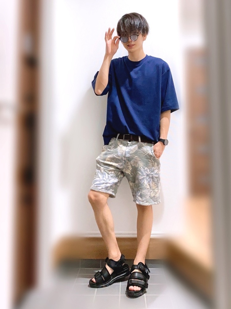 ネイビーTシャツにカラーシャツを合わせ、ボトムスは白のショートパンツで爽やかに着こなしています。総柄のシャツはコーデが難しいのですが、インナーにネイビーTシャツを入れることで、コーデが引き締まって見えますね。