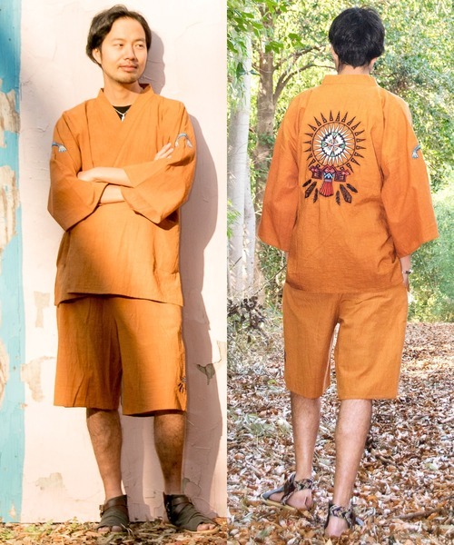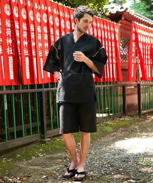 甚平は上下に分かれていますが上衣は羽織より長めで脇にスリットが入っていてゆったりしたものが多いのが特徴。袖口は風通しを良くするため広め。また基本的に帯ではなく、つけ紐を結んで着用。下衣はハーフパンツのようになっています。