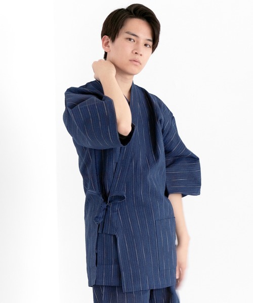 夏らしいしじら織で仕上げられた甚平。硬めの襟芯を使った首周りが全体の雰囲気を引き締めてくれています。脇と袖の部分をはしごレース仕様にしているので通気性も抜群です。無地の他にもセンスの良いストライプの柄のものが多数あります。素材は綿100%で肌触りの良さも魅力です。