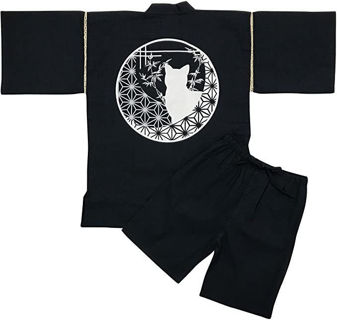 江戸てん しじら織り甚平 捺染プリントオリジナル柄 丸窓の猫