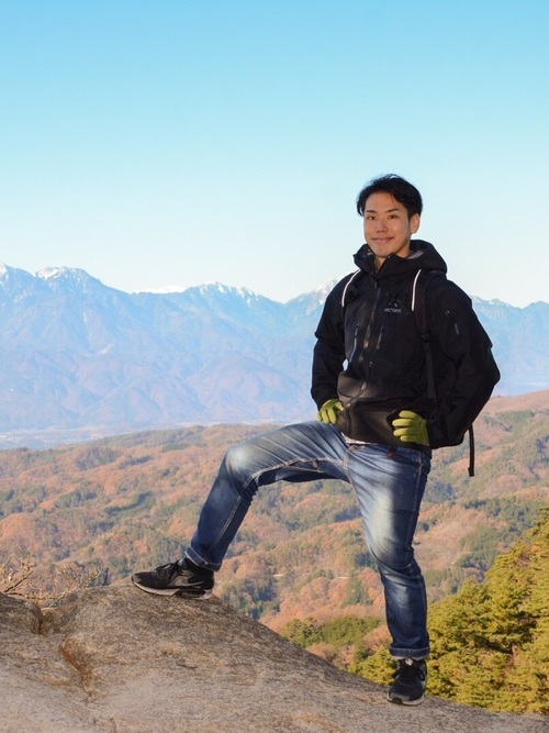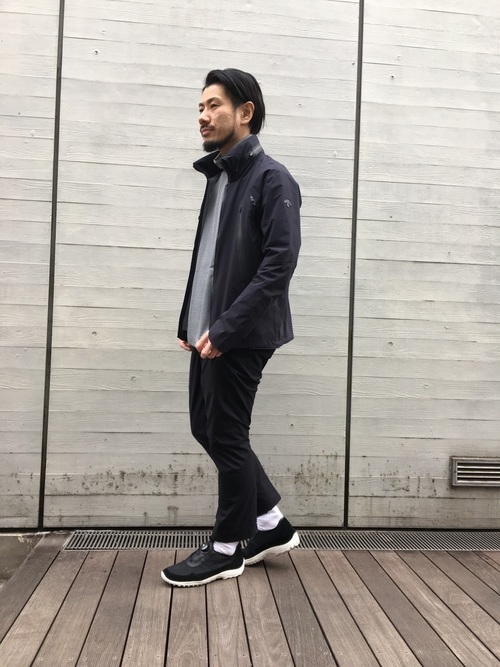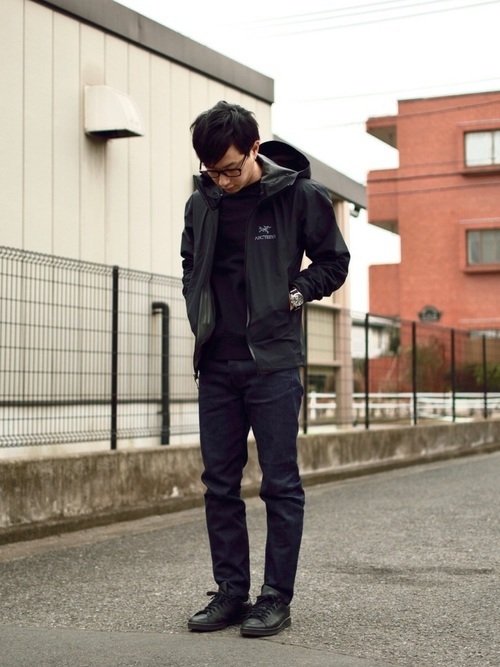 こちらはベータというアークテリクスのハードシェルジャケットとブラックデニムの組み合わせです。ベータはハードシェルジャケットの中でも丈が短いですが、街着として着ていく場合、ちょうどいいサイズ感になります。全体的に細く見えるIラインのシルエットなのでコーデ自体きれいにまとまっているように見えます。