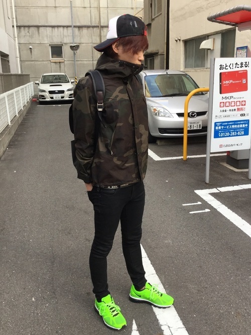 ノースフェイスのハードシェルジャケットとブラックパンツのダーク系のコーデに蛍光色スニーカーを組み合わせたメンズコーデです。迷彩柄のハードシェルジャケットとダーク系のパンツは相性が良く、落ち着いた雰囲気が出ており、街着として出かけても違和感がありません。