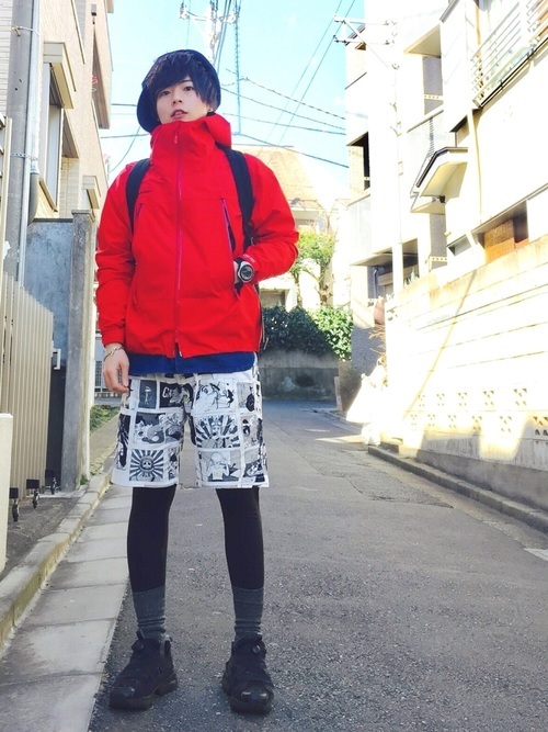 ハードシェルジャケット(赤)×ハーフパンツ【ハードシェルジャケットのメンズコーデ】