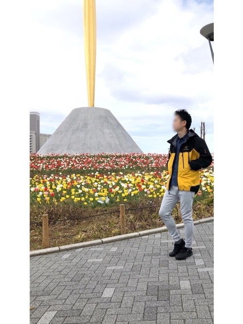 こちらは春の印象にぴったりのコーデです。明るいグレーのデニムと黒と黄色のツートーンカラーのハードシェルジャケットの組み合わせがうまくまとまっており、街着でも軽いアウトドアでも違和感なく出かけることが出来ます。