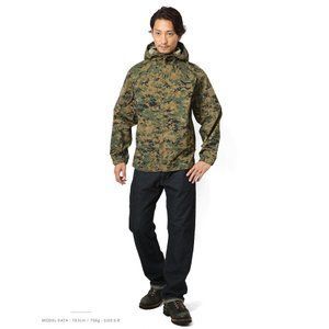 ミリタリー柄のハードシェルジャケット×ブラックパンツ【ハードシェルジャケットのメンズコーデ】