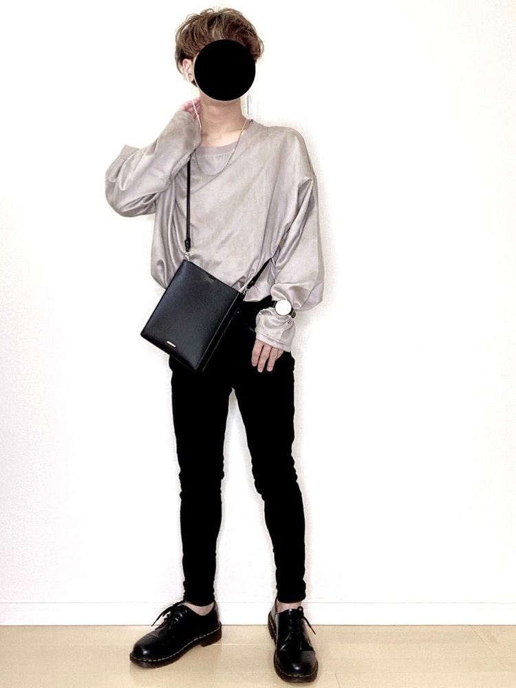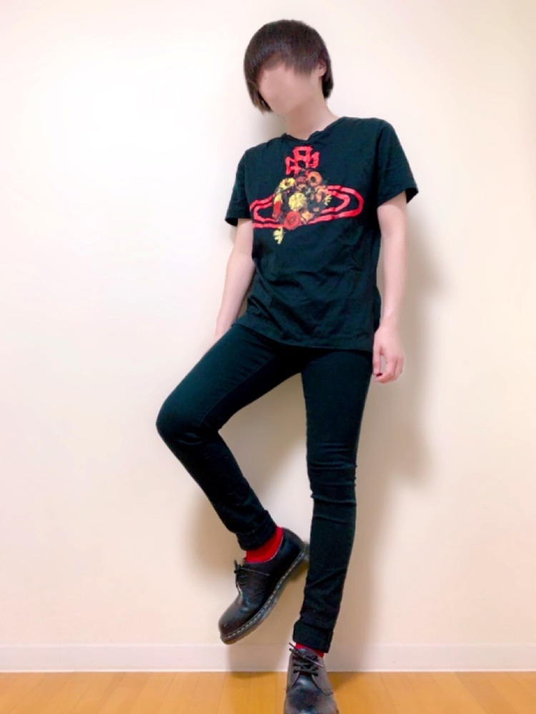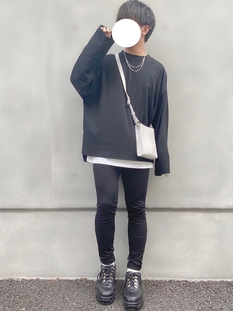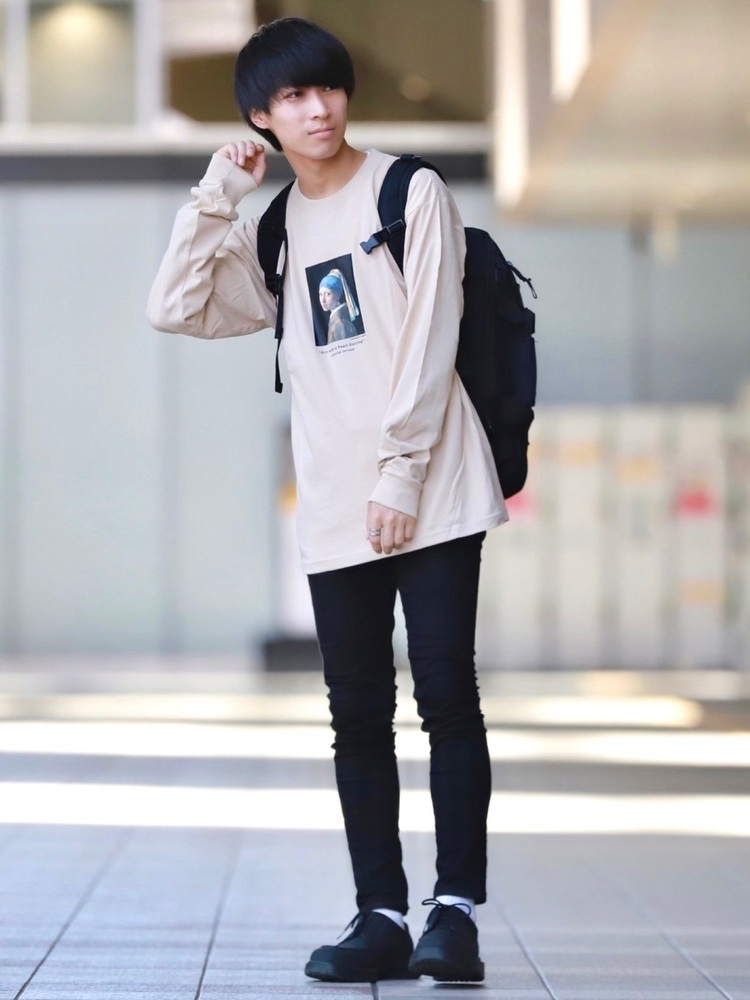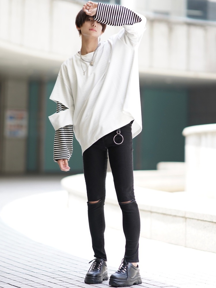 このコーディネートは、黒スキニーに少しゆったりしたシルエットの長袖Tシャツを組み合わせています。シンプルな黒スキニーに印象的なトップスを組み合わせることで、おしゃれに着こなししています。白い靴下をちらっと見せているところもポイントで、丈が長めのスキニーを着用する場合はロールアップして少し短くしても構いません。