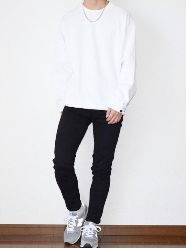 シンプルな白スウェットに黒スキニーを合わせて着こなしているコーデ例です。靴をあえてスニーカーにしたりネックレスをつけることで、全体のコーデとしてシンプルすぎないよう工夫しています。20代から30代まで幅広い年齢層で真似しやすいコーデで、シルエットもスタイリッシュすぎないのでおすすめ。